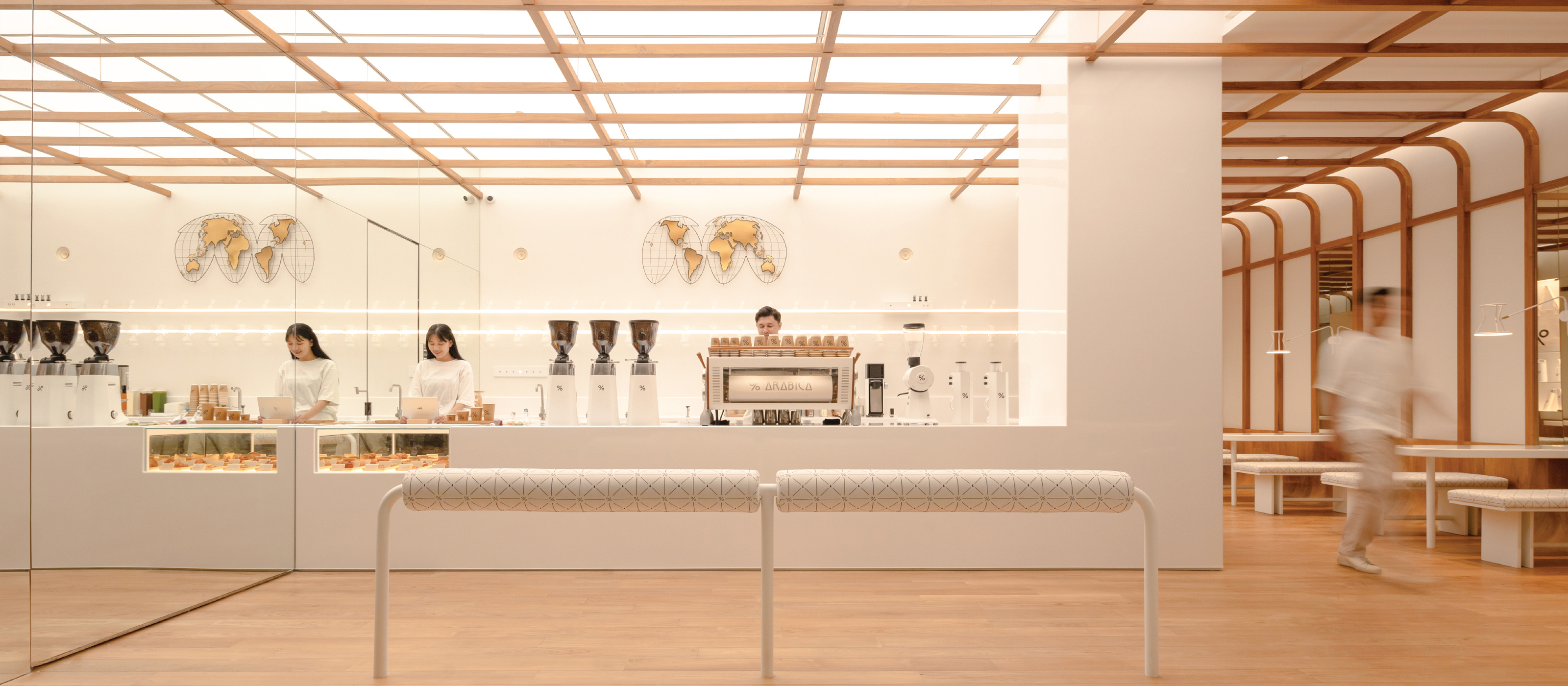 We came up with a design that visually and experientially connects the inside and outside of the store. A wooden pergola runs through both sides, while a series of identical furniture pieces lines the aisle from interior to exterior.