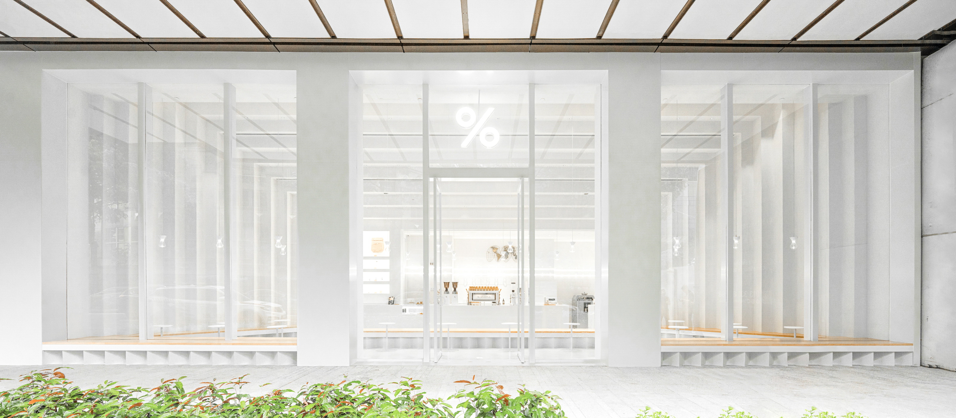 To create a cave-like space, we used lime finished ceiling and walls configured in a step-like pattern that gradually shrink toward the store’s back, paying homage to Batu Caves and bringing perspective to the counter, where the process of coffee production is beautifully presented. The zigzag motif, representing Malaysian culture, intertwined with Japanese aesthetic elements, expresses beauty with the thoroughness of rhythm from its fittings and symbolizes % Arabica’s dedication to meticulous service.