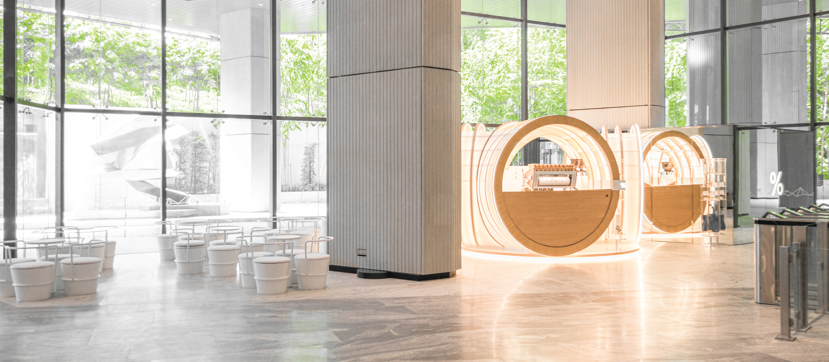 In one corner of the lobby, coffee cup-shaped seating provides a charming and functional spot for those working in the office building to pause and enjoy a freshly brewed cup of coffee.”