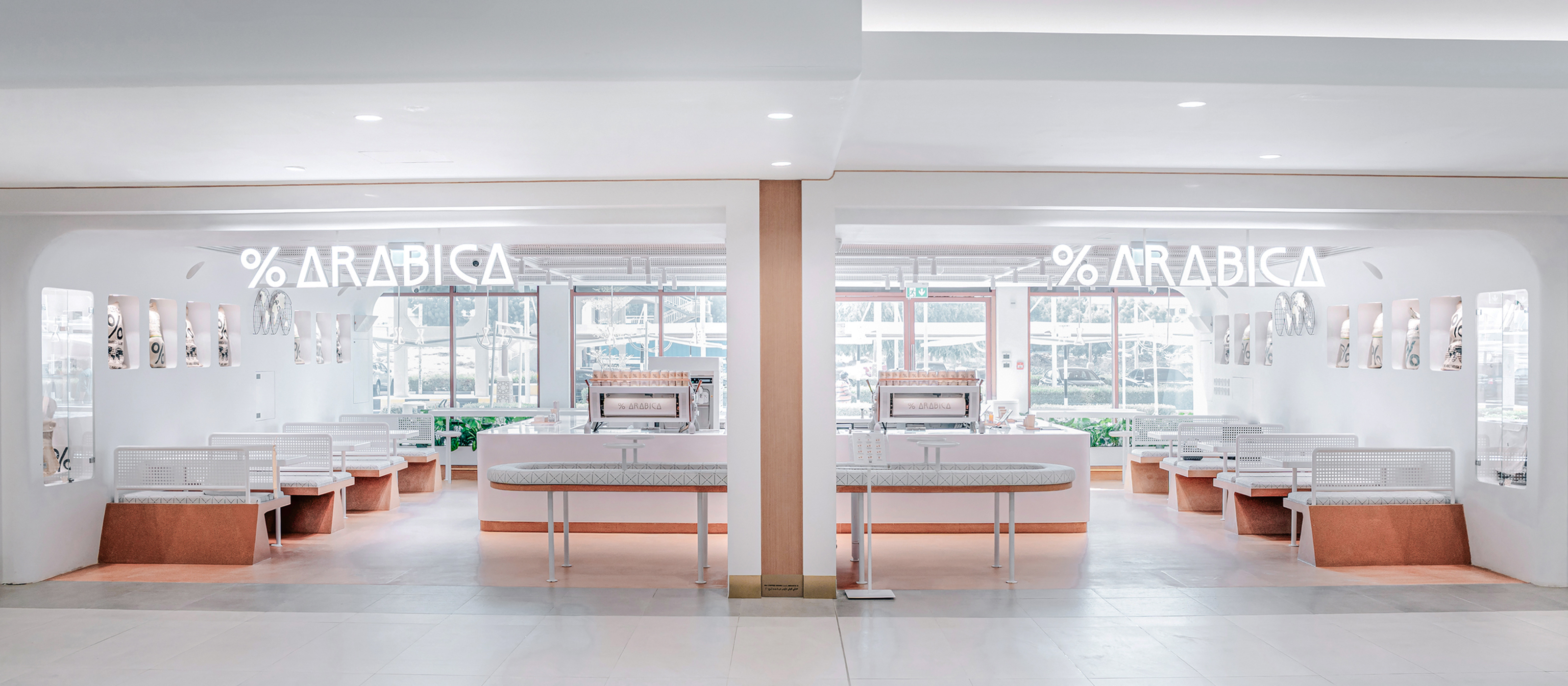 We placed the counter at the center to make it the focal point, ensuring it is easily accessible from all directions. Seating is arranged along the two opposite walls, with shapes inspired by the ‘Δ’ in % ΔRΔBICΔ, complemented by displays of the iconic % Bean Bags and Global Map. As always, % stools are intentionally positioned by the windows so customers can enjoy people-watching.