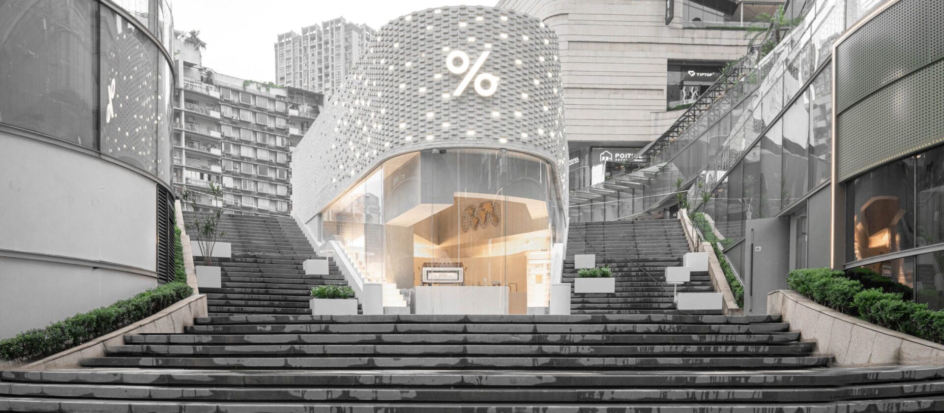 Our very first % Arabica in Chongqing is located at the top of a flight of stairs between the sunken plaza and first floor of Chongqing MixC. You will see a triangle shape store with a full hight clear glass wall while standing at the plaza. In the middle of the huge facade is our iconic “%” logo. The facade wall is adorned with white tiles, and lights have been inset strategically to create an effect that will shine like stars at night. We welcome you to enjoy your favourite % Arabica coffee here with us, no matter day or night ***